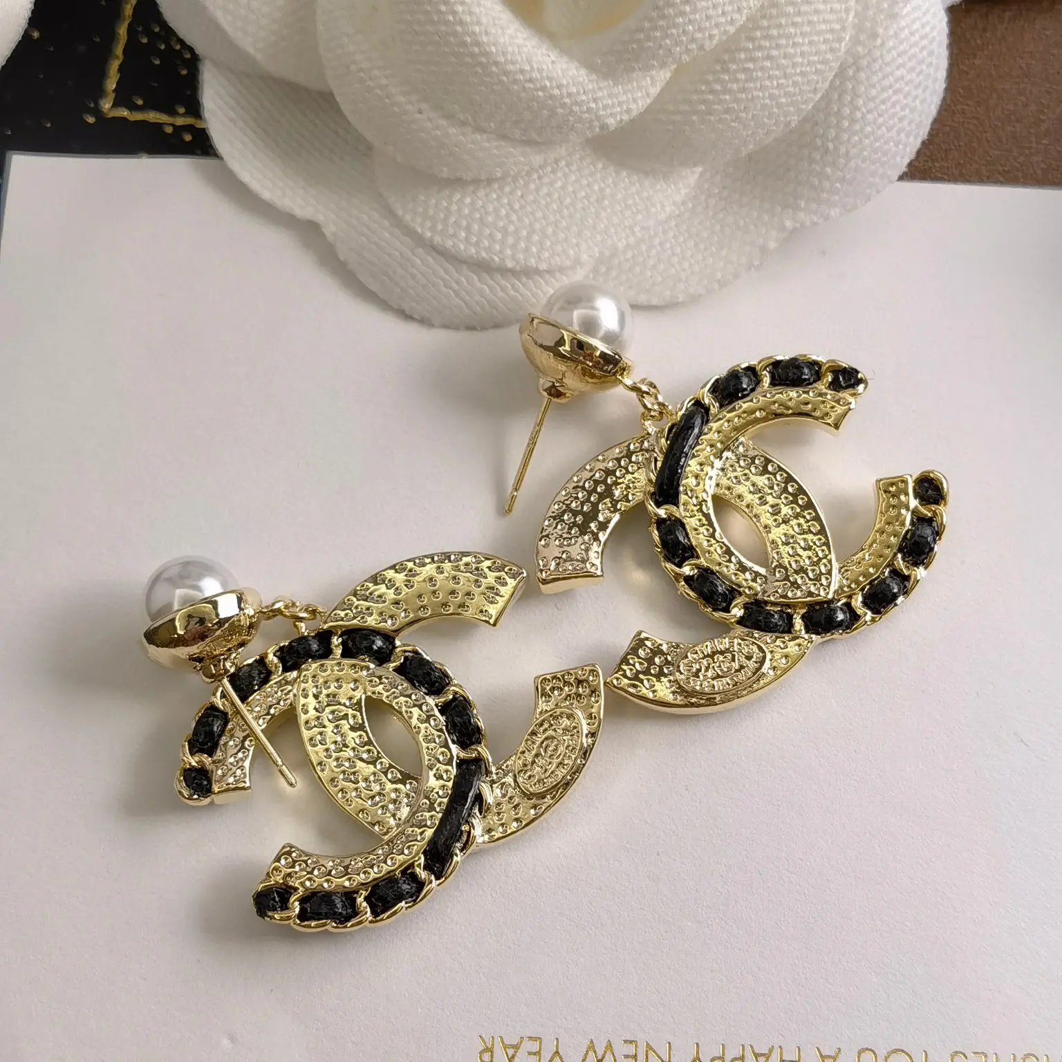 / Chanel Elegant Gold Black Crystal CC Logo Earrings